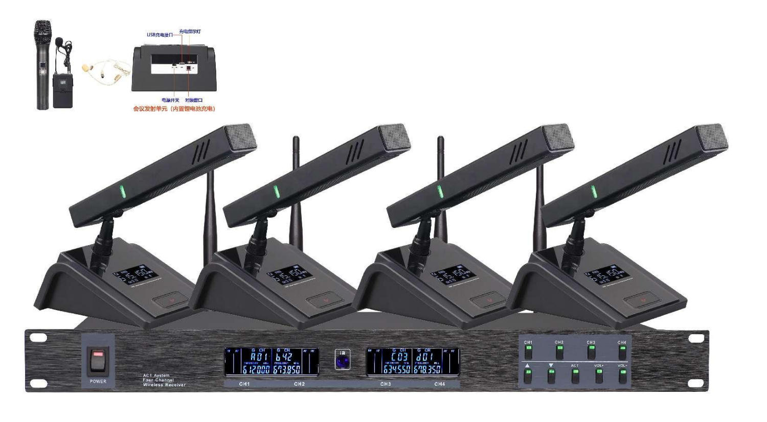 UHF无线会议一拖四(内置锂电池充···